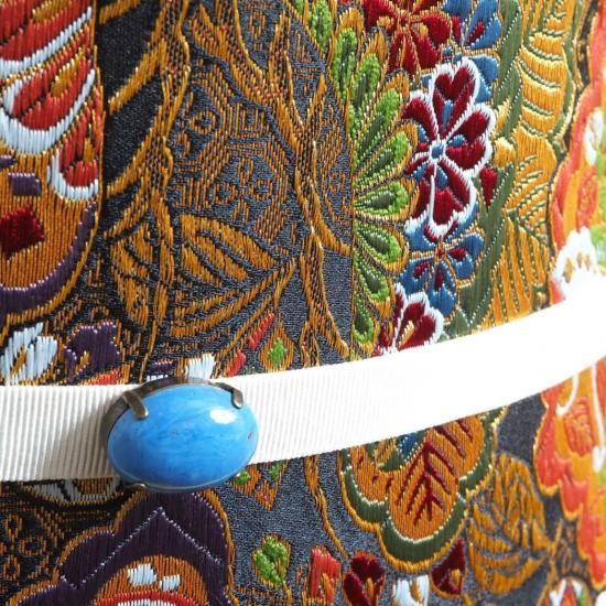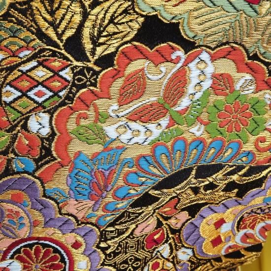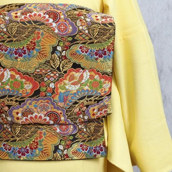 黒地に金をたっぷりと使い、松の柄をベースに、花や家紋、蝶、青海波や亀甲などの柄をカラフルな糸でぎっしりと埋め尽くした豪華な帯。小梅の西陣織シリーズの中では最も重厚な色柄です。