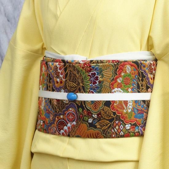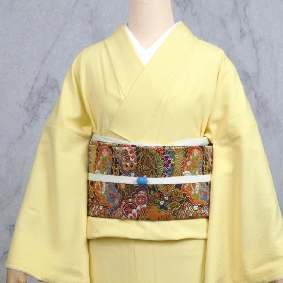 帯の中にさまざまな色が含まれているので、合わせる着物や小物の色は選びません。ただ普段着用の帯ではないので、木綿やウールには不釣り合い。絣など柄のある紬も会いません。着物、小物とも、フォーマルに使えるものを合わせてください。